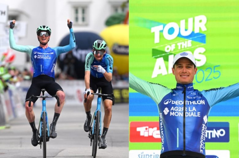 Tour des AlpesQuel bouquet final pour les Français ! Le Tour des Alpes s'est achevé ce vendredi par la 5e et dernière étape, et c'est Nicolas Prodhomme (Decathlon AG2R La Mondiale) qui l'a emporté... devant son coéquipier et compatriote Paul Seixas (Decathlon AG2R La Mondiale) ! Ils se sont débarrassés de leurs compagnons d'échappée dans l'ultime difficulté du jour, et à l'arrivée, c'est Nicolas Prodhomme qui a été récompensé par sa formation et a franchi la ligne en premier, s'offrant ainsi la première victoire de sa carrière. De son côté, Michael Storer (Tudor Pro Cycling Team) a, lui, renversé Thymen Arensman (INEOS Grenadiers) et remporte le maillot vert du classement général.