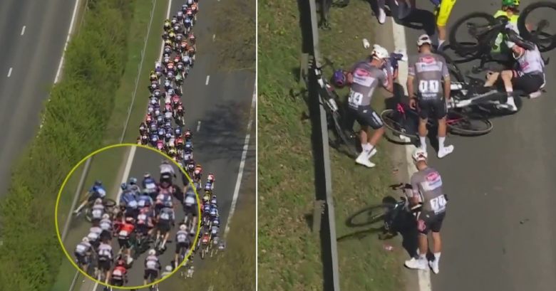 Tour des FlandresMathieu van der Poel ne va pas aborder le final de ce Tour des Flandres dans les meilleures conditions ! Le Néerlandais est en effet tombé à 126 km de l'arrivée, alors que le peloton venait d'aborder les premiers monts et que la nervosité commençait à monter. Plutôt mal placé en deuxième partie du peloton, le leader d'Alpecin-Deceuninck est allé au sol suite à une erreur d'un coureur EF Education-Easy Post, qui a provoqué cette chute et entraîné avec lui une dizaine de coureurs, dont Tim Wellens (UAE Emirates). Plus de peur que de mal pour MVDP, qui s'est relevé sans plus de conséquences et est reparti entouré de deux équipiers à un peu plus d'une minute du peloton avant l'Eikenberg. Le tenant du titre a pu opérer la jonction quelques kilomètres plus loin, au moment où la course commençait à s'animer. Reste désormais à savoir si cette chute lui portera préjudice ou non dans son duel attendu avec Tadej Pogacar...