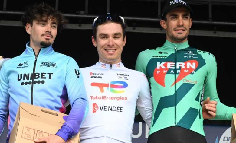 Tour du DoubsLe Triptyque Franc-Comtois prenait fin ce dimanche 20 avril avec son 3e et dernier acte : le Tour du Doubs ! Organisée par le Vélo Club Morteau Montbenoit, cette épreuve faisait office de 8e manche de la Coupe de France FDJ et proposait un parcours vallonné de 197 kilomètres, avec 2800 mètres de dénivelé positif avant d'arriver à Morteau. Contrairement aux deux derniers jours, pas d'arrivée au sommet et donc une course plus débridée et ouverte qui a offert un final à suspense... avec la victoire de Mattéo Vercher ! Membre d'un groupe de sept costauds qui s'est constitué dans les dernières difficultés et qui s'est finalement joué la gagne au sprint, l'ancien champion de France amateur 2022 et coureur de la TotalEnergies s'est montré le plus malin et rapide dans cette arrivée en légère montée pour s'offrir sa toute première victoire chez les professionnels.