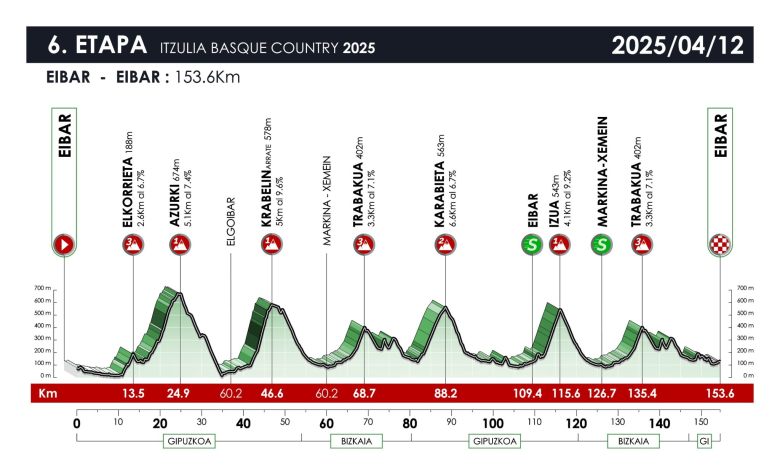 Samedi 12 avril - Étape 6 : Eibar - Eibar / 153,6 km (départ à 13h30, arrivée vers 17h30)