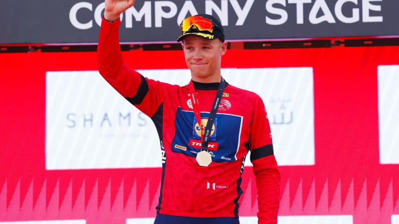 UAE TourL'UAE Tour débutait ce lundi avec une 1ère étape comme souvent promise aux sprinteurs, venus en nombre pour cette semaine de compétition sur les routes émiraties. Après un parcours de 138 km sans réelle difficulté excepté le vent, on a logiquement assisté à un sprint royal sur cette arrivée atypique en légère montée à Liwa Palace, avec 500 derniers mètres à 6% de moyenne. Malgré un coup de bordure initié par un certain Tadej Pogacar (UAE Team Emirates), c'est Jonathan Milan (Lidl-Trek) qui s'est imposé au sprint. L'Italien semblait très fatigué à l'arrivée, mais content de remporter cette première bataille de sprinteurs.