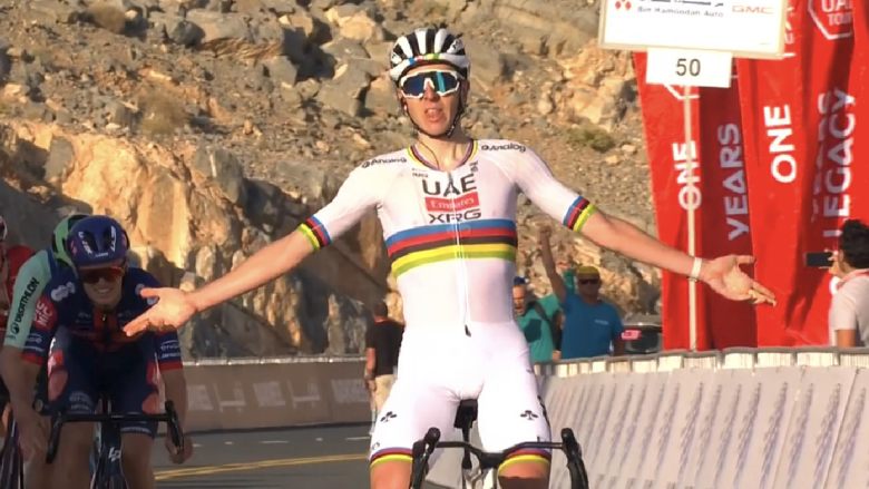 Au pied de Jebel Jais, les fuyards sont tous repris et la formation UAE Team Emirates XRG met en place son train. Après un gros boulot tout au long de la journée de Rune Herregodts, c'est Mikkel Bjerg et Florian Vermeersch qui mènent ce train. En quelques kilomètres, le peloton est réduit de moitié. Alors qu'Einer Rubio (Movistar Team) est victime d'un ennui mécanique et doit changer de vélo, lui qui avait levé les bras au sommet de cette ascension en 2023. Si le Colombien fini par rentrer, Tom Gloag (Visma | Lease a Bike) lui craque, alors qu'il reste toujours une cinquantaine de coureurs dans le peloton. A 7 kilomètres du sommet, c'est au tour de Domen Novak (UAE Team Emirates XRG) de prendre le relais, puis s'écarte à 4 bornes. C'est ensuite la formation Decathlon AG2R La Mondiale qui impose son rythme. La sélection par l'arrière continue. Bruno Armirail, puis Geoffrey Bouchard et Paul Seixas roulent. Et Felix Gall, passe à l'attaque à 2 kilomètres de l'arrivée. Mais Jay Vine fait un gros boulot pour Pogacar, reprend Gall et emmène le Champion du Monde jusqu'à 200 mètres de la ligne. Moment choisi par "Pogi", pour lancer le sprint. Personne n'arrive à prendre sa roue sur l'accélération, mais ça gère bien l'écart derrière lui. Oscar Onley (Team Picnic PostNL) et Felix Gall (Decathlon AG2R La Mondiale), parviennent à revenir (ou presque) dans sa roue, mais c'est trop tard... Tadej Pogacar ouvre son compteur de victoires en 2025, avec ce succès sur la 3e étape ! Le Britannique prend lui la 2e place, l'Autrichien la 3e. Lennert Van Eetvelt (4e, Lotto), Giulio Ciccone (5e, Lidl-Trek) et Finn Fisher-Black (6e, Red Bull-BORA-hansgrohe) terminent eux aussi dans le même temps. A noter également la très belle 10e place de Paul Seixas, qui vient chercher là son premier top 10 en WorldTour, à seulement 18 ans.