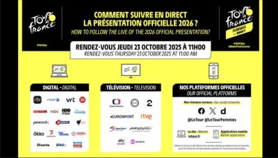 La présentation aura donc lieu ce jeudi 23 octobre au Palais des Congrès à Paris. Elle sera également à suivre en direct sur les antennes d’Eurosport en France, à partir de 11h. Pour ceux ne possédant pas la chaîne, il sera également possible de suivre cet événement en direct via les plateformes france.tv ou HBO MAX. En Belgique, ce sera RTBF Auvio qui diffusera l’événement. À noter que la présentation sera également retransmise sur les réseaux sociaux officiels du Tour de France, mais aussi sur le site et l’application du Tour.
