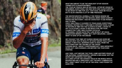 "Ce qui devait être le moment fort de ma saison s'est transformé en déception. Le Tour de France était mon grand objectif. Après mon accident en décembre, tout ce que j'ai fait avait un seul et unique but : être prêt à temps pour juillet. Cet objectif m'a permis de me concentrer, mais il m'a également mis sous pression. Les mois d'hiver, qui sont normalement la période où nous construisons une base solide pour la saison, ont été consacrés à la rééducation et à la récupération. Je n'avais pas d'autre choix que d'être patient : je devais guérir. Une fois que j'ai finalement été autorisé à m'entraîner à nouveau, tout s'est soudainement accéléré. C'était devenu une course continue : une course pour être prêt à temps pour les classiques en avril, une course pour atteindre l'altitude, une course pour être prêt pour le Tour... J'avais toujours l'impression d'être en retard. À l'entraînement, je ne me sentais pas moi-même : mes sensations habituelles n'étaient pas là. Mais j'ai continué à y croire. Je ne voulais pas abandonner mon rêve. Nous pensions que le temps passé en rééducation m'avait permis de me reposer suffisamment. Mais en réalité, mon corps n'avait jamais vraiment eu de pause, il travaillait encore dur pour guérir des fractures et du traumatisme causés par l'accident", explique le champion olympique.