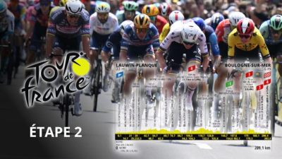 Tour de FranceLe Tour de France est désormais bien lancé ! Après la victoire royale au sprint de Jasper Philipsen (Alpecin-Deceuninck) à Lille, la 2e étape va proposer aux coureurs un parcours bien plus accidenté ce dimanche 6 juillet, avec 209,1 km (soit la plus longue étape de ces trois semaines) et 2 550 mètres de dénivelé au menu entre Lauwin-Planque et Boulogne-sur-Mer, où le maillot Jaune pourrait bien changer d'épaules. D'autant que la pluie s'est invitée au départ de cette 2e étape du Tour. C'est même le déluge mais le soleil devrait réapparaître dans la dernière heure de course et l'arrivée à Boulogne-sur-Mer.