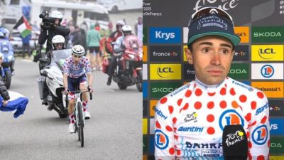 Après l'arrivée, le Français est revenu sur sa belle performance : "On avait un plan au départ ce matin et on l’a réalisé presque à 100 %. Je voulais prendre tous les points à l’exception de l’arrivée et finalement je n’ai pas réussi à passer en tête à Peyresourde mais j’ai quand même pris la deuxième place parce qu’Arensman a réussi à partir en solitaire. Je n’avais plus grand-chose dans les jambes".