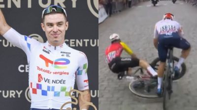 Tour de FranceÀ l'issue de cette première journée entre Lille Métropole et Lille Métropole (189 km), Mattéo Vercher (Team TotalEnergies) a été récompensé par le prix de la combativité. Premier attaquant dès le lever de drapeau de Christian Prudhomme (directeur du Tour de France) au kilomètre zéro, le Lyonnais de 24 ans a même relancé une deuxième échappée en compagnie de Benjamin Thomas (Team Cofidis). Les deux hommes se sont disputé avec rage les points de la montagne, notamment au Mont Cassel, où Thomas, en jetant son vélo sur la ligne, a malheureusement fauché Mattéo Vercher. Après l'étape, le coureur de la formation TotalEnergies s'est exprimé au micro de l'organisation sur cette première image forte de la 112e édition du Tour de France.