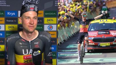 Le vainqueur d'étape a donc détaillé le déroulement de l'étape, qui l'a vu se retrouver à l'avant et finalement s'imposer : "Tout à coup, il y a eu la chute. Tadej l'a dit, on a essayé de ralentir pour attendre, mais les attaques ont continué, j'ai suivi un mouvement et je me suis retrouvé dans l'échappée. Et ensuite, dans l'ascension, ça a explosé de nouveau. Et sur la dernière montée du jour, je me sentais vraiment bien. J'ai vu que les autres aussi se sentaient vraiment bien, mais je savais que j'allais y aller seul. Au sommet, j'ai senti que c'était le bon moment et j'ai senti que j'avais les jambes pour tenir jusqu'au bout. je savais que je rejoindrais une très belle liste de coureurs ayant gagné sur les trois Grands Tours. Je savais que j'allais profiter du moment. J'ai continué à pousser jusqu'à la fin car j'avais envie d'en profiter et peut-être soulever mon vélo après la ligne... Mais j'étais si content de gagner que j'ai oublié de le faire."