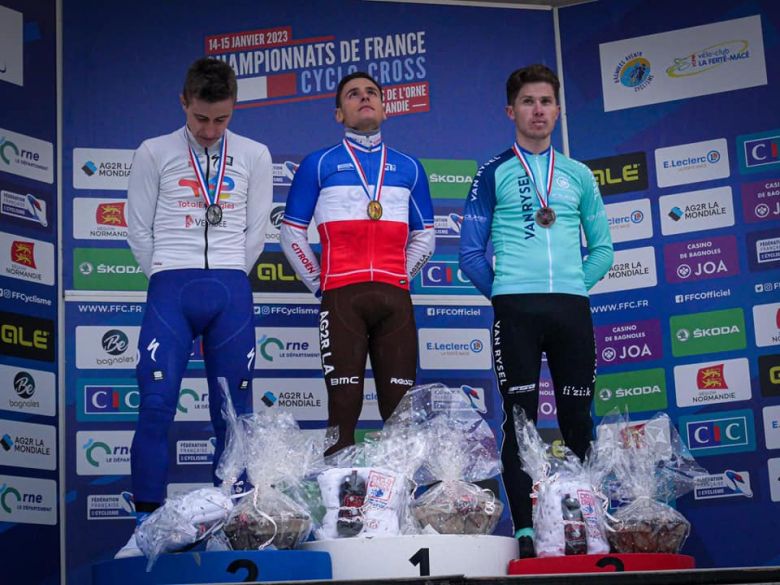 Disputés ce week-end à Bagnoles de l'Orne, les Championnats de France de cyclo-cross se sont conclus ce dimanche après-midi par la victoire de Clément Venturini sur l'épreuve Élite Hommes ! Titré pour la cinquième fois de sa carrière (2017, 2019, 2020, 2021 et 2023), le Rhodanien de la formation AG2R Citroën Team a fait la différence sur Fabien Doubey (Team TotalEnergies), vice-champion de France, en toute fin de course grâce à une attaque dans la dernière bosse du circuit. Seulement dixième l'an dernier à Liévin, Clément Venturini récupère donc son maillot bleu-blanc-rouge laissé pendant un an à Joshua Dubau (Van Rysel CX Racing Team), troisième ce dimanche. Le top 5 a été complété par David Menut (AS Bike Racing) et Lucas Dubau, le frère et coéquipier de Joshua.