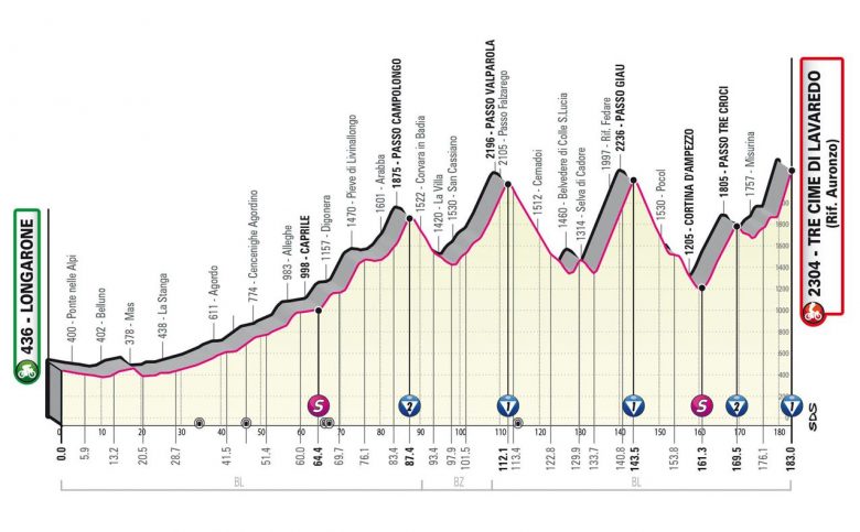 Si de belles et grandes étapes de montagne ont déjà été disputées par les coureurs du Tour d'Italie depuis le Grand Départ des Abruzzes, la 19e étape de vendredi présente un profil qui va en effrayer plus d'un ! Les 100 dernies kilomètres sont en effet terribles, avec cinq ascensions répertoriées à gravir, dont le redoutable Passo Giau (9,9 km à 9,3%). L'enchaînement et la difficulté des cols vont assurément provoquer beaucoup de dégâts, et les leaders du classement général ne devront pas avoir une journée sans, au risque de tout perdre au sommet des Tre Cime di Lavaredo et ses 4 derniers kilomètres de montée à près de 12% de moyenne !