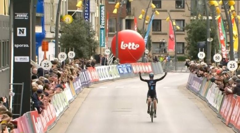With an attack in De Moeren, Pfeiffer Georgi has left everyone behind. The British rider solos to victory in the Classic Brugge-De Panne!#ClassicBruggeDePanne #BruggeDePanne pic.twitter.com/cgR5RoLnMs