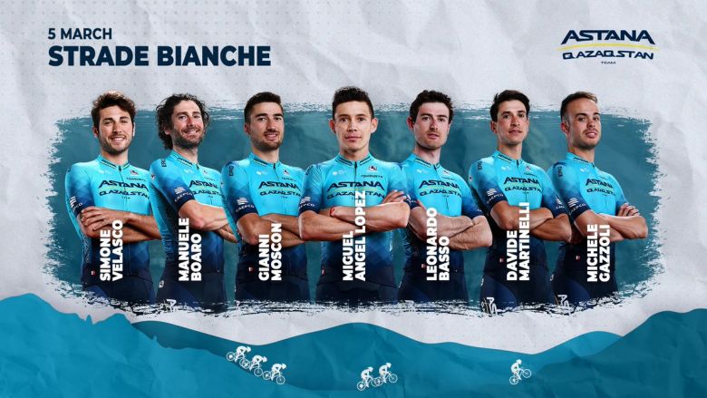 L'équipe Astana Qazaqstan Team a dévoilé sa sélection pour les Strade Bianche qui ont lieu ce samedi. La formation kazakhe a fait appel au grimpeur colombien Miguel Angel Lopez, qui pourrait avoir son mot à dire sur cette course atypique et imiter son compatriote Egan Bernal, 3e l'an passé. À ses côtés, Lopez pourra compter sur Gianni Moscon, Manuele Boaro, Simone Velasco, Leonardo Basso, Davide Martinelli et Michele Gazzoli. En revanche, Alexey Lutsenko, vainqueur de la Clasica Jaen Paraiso Interior il y a quelques jours (une course qui comporte également des chemins de terre), ne sera pas au départ des Strade Bianche, privilégiant Paris-Nice.