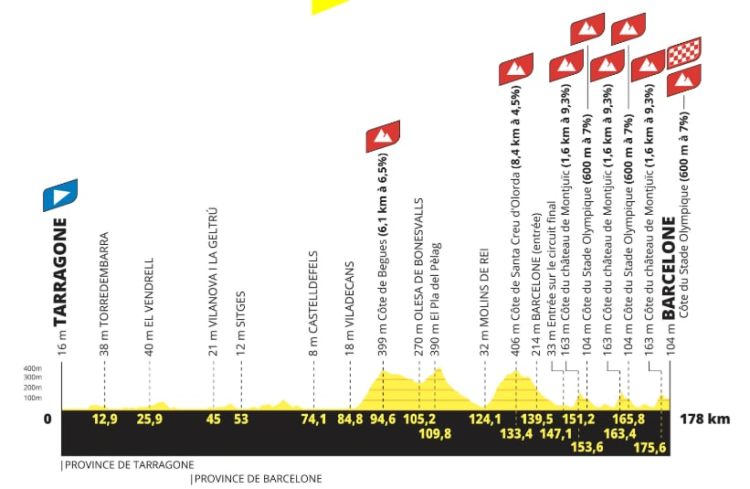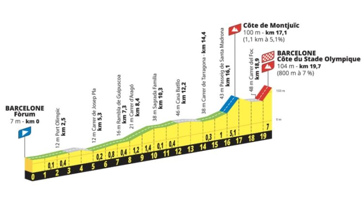 Le classement de l'étape sera établi sur le chrono du premier coureur de chaque équipe. Mais, selon la formule validée sur Paris-Nice, les temps seront enregistrés de manière individuelle pour le classement général. Attention aux écarts ! Le parcours favorisera d'abord la puissance collective avec, après un départ depuis les plages, un bel aller-retour en bord de mer puis, en passant au pied de la Sagrada Família, une enfilade de boulevards plats et rectilignes qui seront avalés à pleine vitesse. Mais le final, ponctué de deux côtes successives - les ascensions des côtes de Montjuïc (1,1 km à 5,1 %) et du stade Olympique (800 m à 7 %) - pour amener au niveau du stade olympique de Montjuïc, fera sauter les beaux ordonnancements et contraindra les favoris à déjà se découvrir.