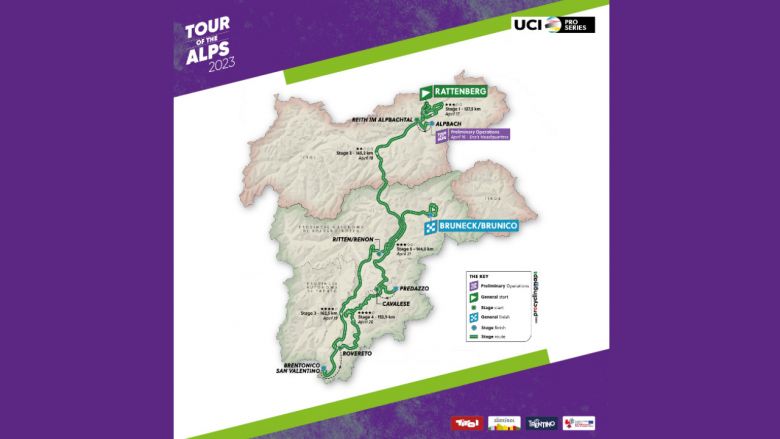Le parcours du Tour des Alpes 2023, qui se déroulera entre le lundi 17 et le vendredi 21 avril, a été dévoilé par l'organisation. Et il sera encore plus dur et attractif que les années précédentes. Il n'y aura pas d'étapes de transitions, mais cinq étapes de montagne. Selon l'organisation, "Cinq étapes courtes et passionnantes" ont été tracées entre Rattenberg et Brunico dans les régions du Trentin, du Tyrol du Sud et du Tyrol. Au total, le tour fera 752,6 kilomètres. Chaque étape dispose également d'un dénivelé positif important.